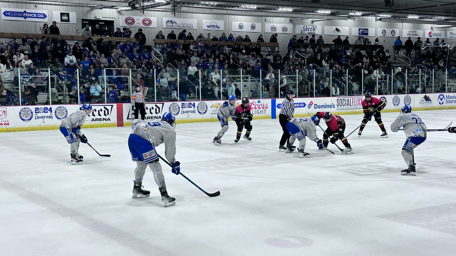 Friday’s game had Helena celebrating a 9-5 victory. Goals for Helena were scored by Hunter Coulombe (Jeffrey Hershberger, Clint Isakson), Hunter Coulombe (Kelton Chadwick, Finn Theriault), Chase Berg (Finn Theriault), Kade Pareja (Kelton Chadwick, Hunter Coulombe), Trey Pareja (Kelton Chadwick, Maddux Hale), Owen Gruener (Garrett Lindsey, Trey Pareja), Chase Berg (Kade Pareja, Kelton Chadwick), Owen Gruener (unassisted), and Colin Becker (Kelton Chadwick, Trey Pareja). Goalie Malik Johnson stopped 15 of the 20 shots on his net.