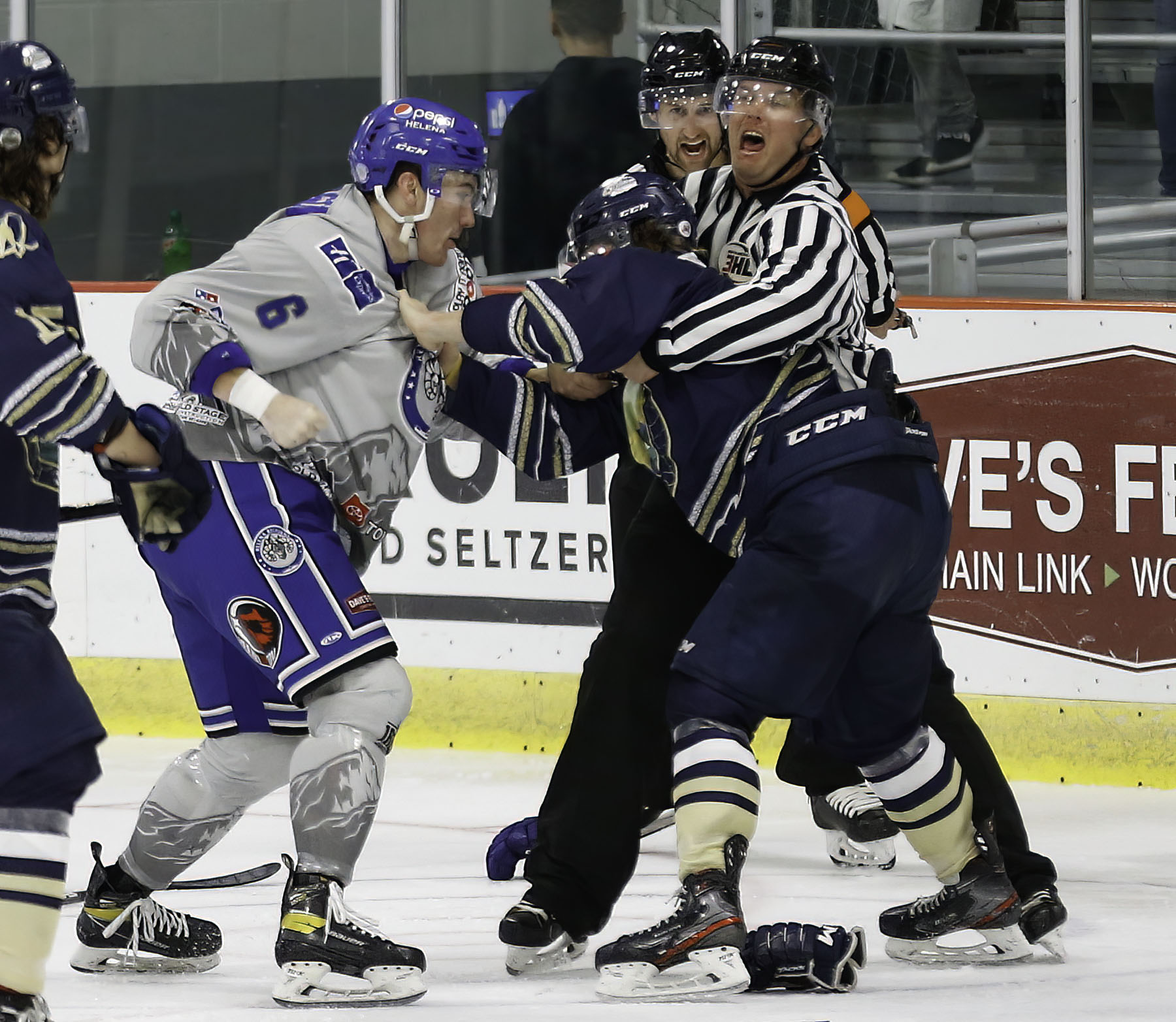 First period goals for the Bighorns were scored by Tylor Greene (assisted by Sam Feamster), Sam Feamster (assisted by Liam Bland), Jonny Peterson (assisted by Taber Gutschick and Adam Harvey).