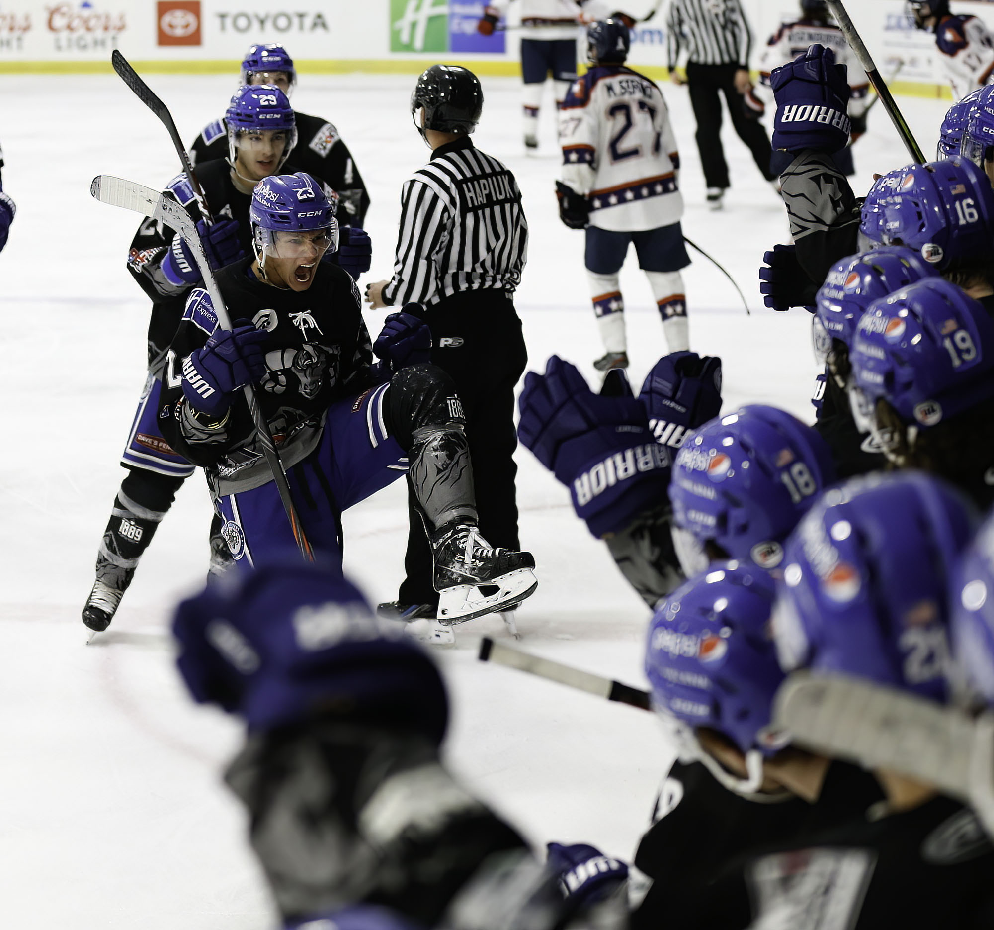 Saturday’s game ended in a 5-3 win for the Bighorns.  Goals were scored by Adam Harvey (assisted by Gavyn Galloway and Andrew MacCallum), Jonny Peterson (assisted by Adam Harvey and Gavyn Galloway), Andrew MacCallum (assisted by Adam Harvey and Jonny Peterson), Tylor Greene (assisted by Liam Bland), and Taber Gutschick (assisted by Gavyn Galloway and Harlan Wojtusik).  In net was Erik Buchholz with 69 shots and 66 saves.