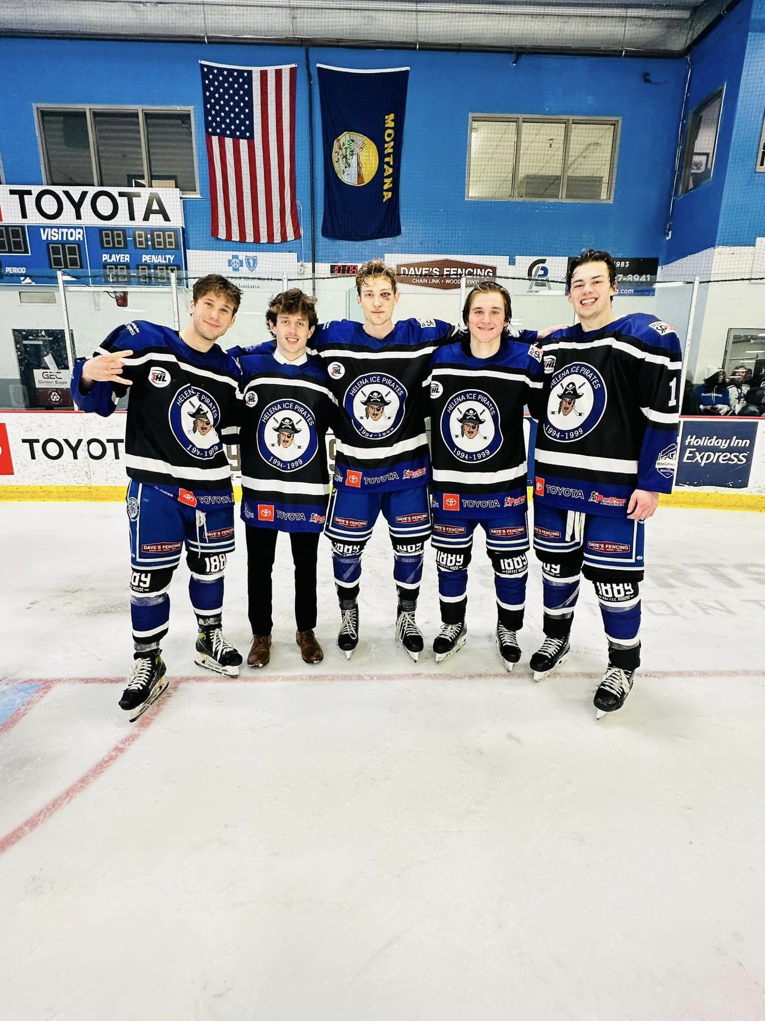 Saturday’s night’s game was a sellout crowd, with many Bighorns fans eagerly anticipating a fun night of revenge between the two teams from the night before. Helena wasted no time showing Yellowstone who the top team was, scoring a total of 10 goals, and not letting Yellowstone get a single point on the board. Helena’s goals were scored by Thomas Hollon (Cade Holland), Derek Rassell (Ty Moore, Andrew Deskin), Braden Cunningham (Tyler Bloom, Camden Cunningham), Andrew Deskin (Ty Moore, Dylan Cunningham), Tyler Bloom (Braden Cunningham), Lyndon Orr (Tyler Alldredge, Luc Corbin), Owen Ramsay (Darby McCarthy), Derek Rassell (Andrew Deskin, Ty Moore), Andrew Deskin (Ty Moore, Lyndon Orr), and again by Derek Rassell giving him the only hat trick of the night (Thomas Hollon, Andrew Deskin). Helena Cycle Center, Saturday night’s game sponsor, donated $1,100; $100 for every Bighorns goal, and $100 per hat trick, to the Bob Greene Memorial Fund. It was also Helena’s annual jersey auction night, where players wore replica Ice Pirates jerseys, raising $7,500, with proceeds of the auction going to the Helena Figure Skating Club.