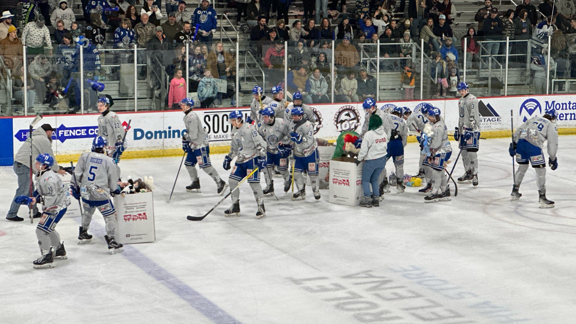 Saturday night’s game had the Great Falls Americans in town, and Helena celebrating their annual teddy bear toss night. Cam Young scored on a breakaway with less than two minutes left in the first period, and the players collected a total of 17 boxes of bears for Toys For Tots. The game ended in a 3-1 win for the Bighorns, with Kade Pareja (Colin Becker), and Jason Hammett (Owen Gruener, Colin Becker), scoring the other two goals. Appleman was solid again in Helena’s net, stopping 19 of 20 shots.